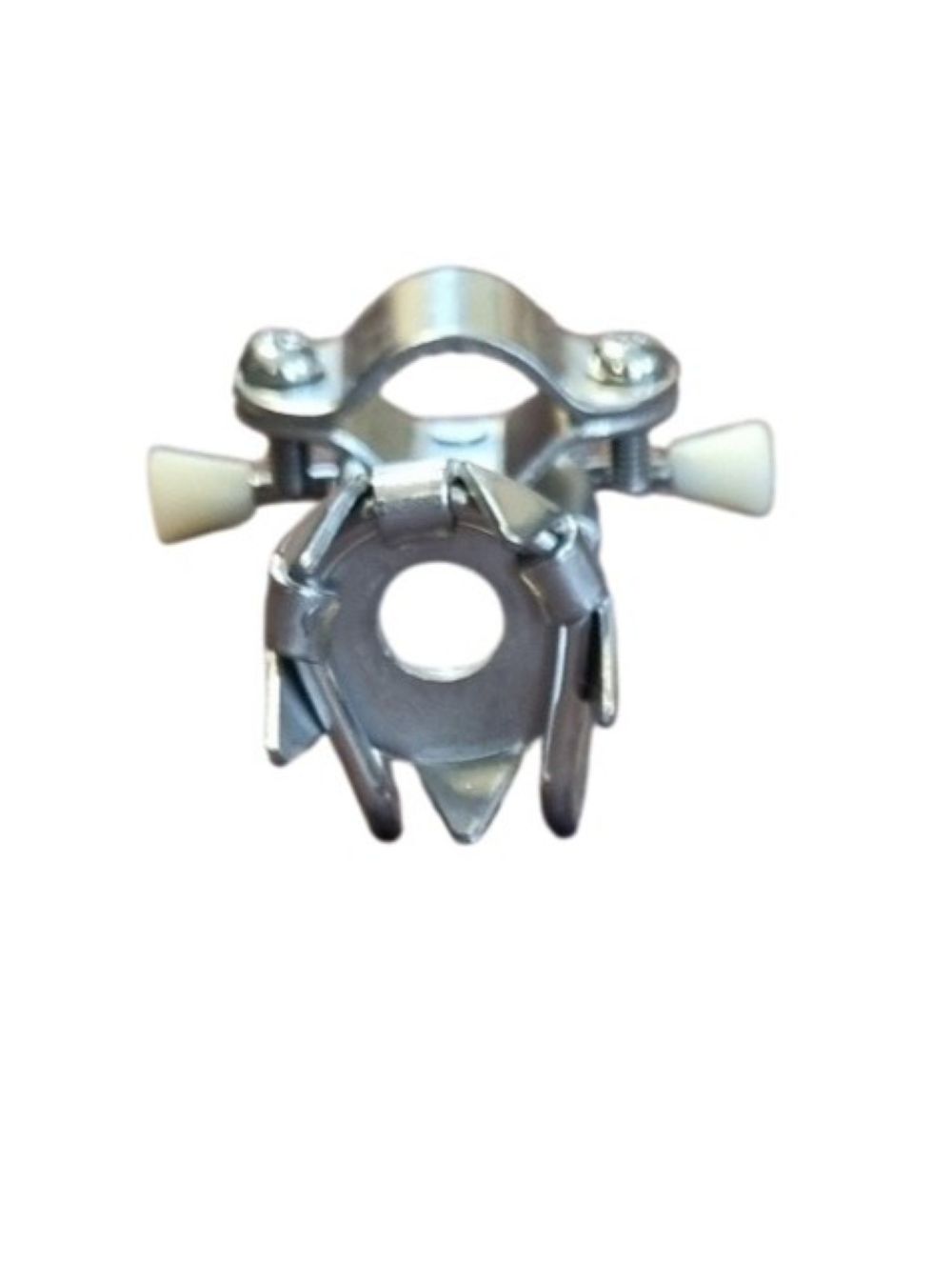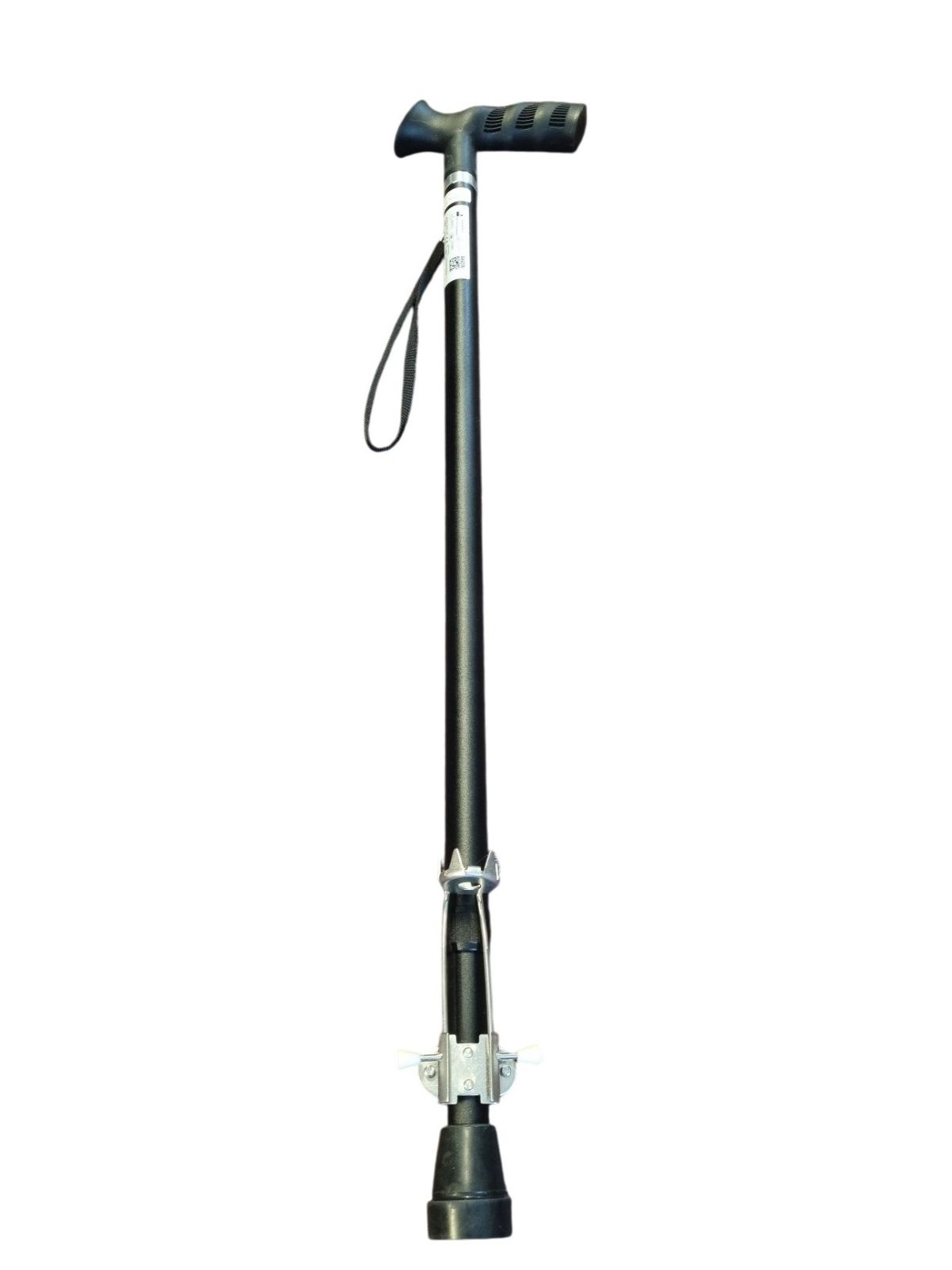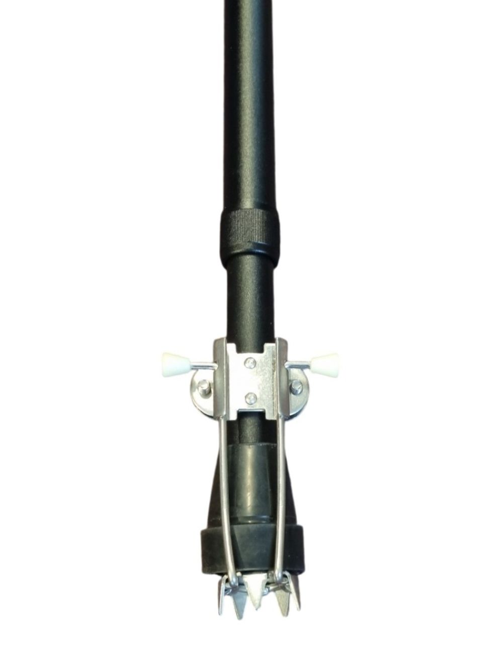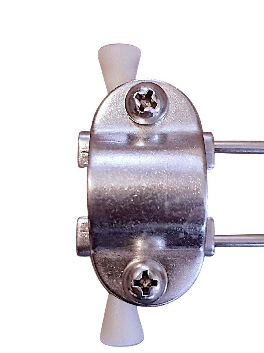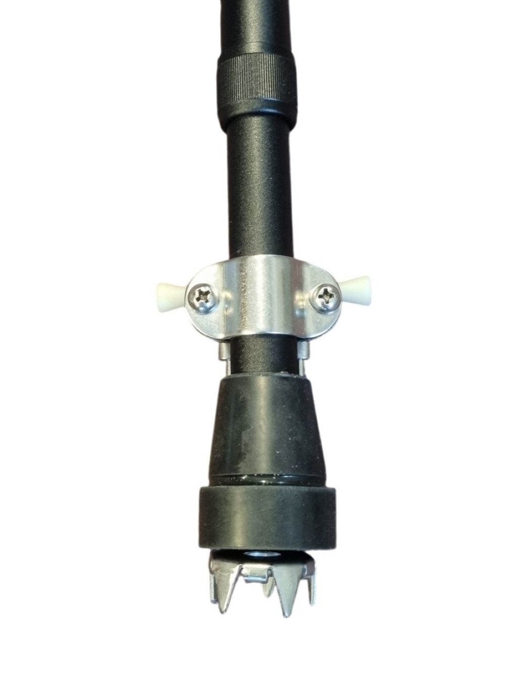 U plaatst het klemmetje om de buis van de wandelstok of elleboogkruk, direct boven de bestaande rubberdop. Het is niet nodig om de rubberdop te verwijderen. De vijf pinnen sluiten onder de rubberdop aan, waardoor de stok via de rubberdop rechtstreeks op de pinnen steunt. De plateauvorm onder de pinnen voorkomt beschadiging van de rubberdop.